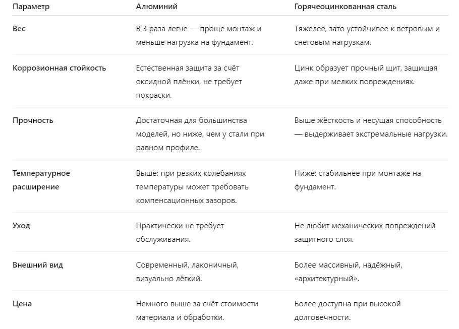 Правильный фундамент, точный монтаж, качественные материалы — и алюминий, и сталь покажут себя с лучшей стороны.
