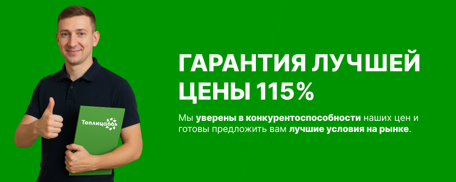 - Гарантия лучшей цены: Если вы купили у нас теплицу и в течение двух недель нашли аналогичную по более низкой цене, мы готовы компенсировать вам разницу. Для этого необходимо предоставить коммерческое предложение от согласованного списка поставщиков. Мы выписываем подарочный сертификат на 120% от разницы в цене, который можно использовать для оплаты до 20% от стоимости будущей покупки.